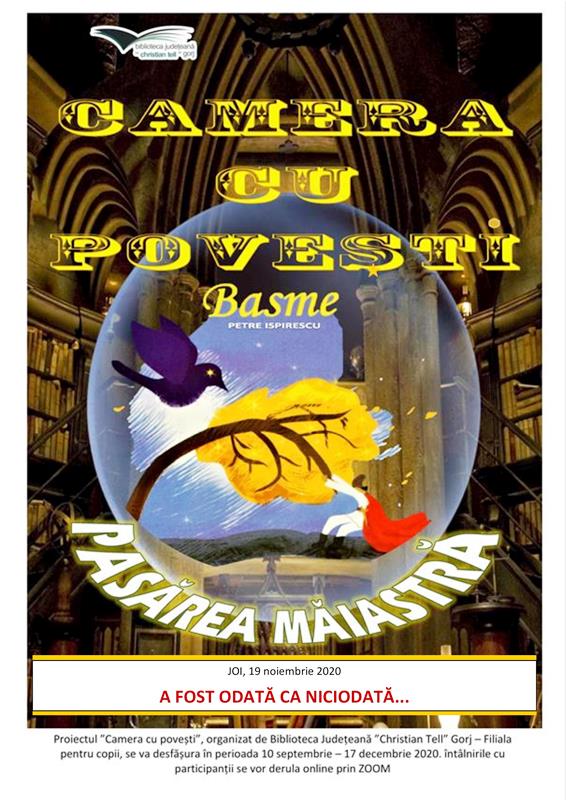 imagini distorsionate, sub îndrumarea coordonatorilor proiectului, Luiza Sandu, Cosmin Văcaru și Lucian Dobroiu. Săptămâna aceasta sunt programate două astfel de întâlniri, ce se vor desfășura joi, 19 noiembrie, și vineri, 20 noiembrie. Tema întâlnirii de joi va fi „Pasărea măiastră”, de Petre Ispirescu, iar vineri elevii vor vorbi despre o altă cunoscută povestire semnată de Ion Creangă, ,,Prostia omenească”. Proiectul ,,Camera cu povești” se va derula până pe 17 decembrie 2020.