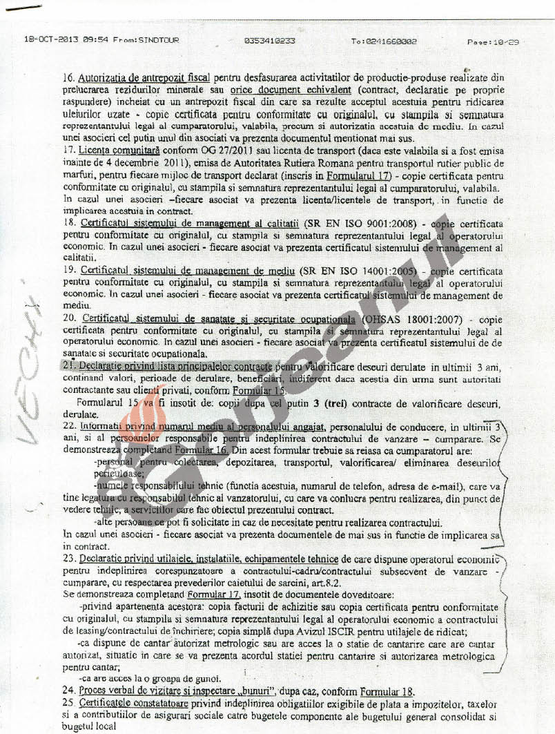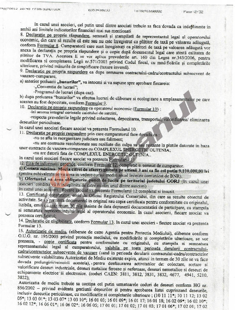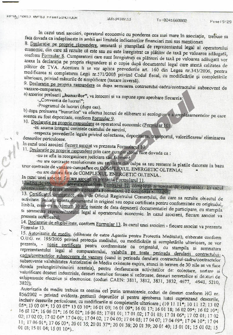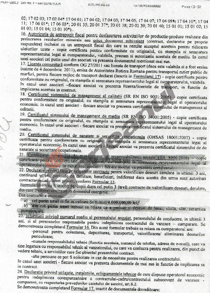 Petroniu nu se opreşte aici în modificările făcute caietului de sarcini, care pare realizat pentru un câştigător anume, ci mai completează noul caiet cu alte cerinţe de ultimă oră. Una priveşte obligativitatea pentru participanţi, participanţi din Gorj evident, să mai fi fost abonate la astfel de contracte pe la unităţile energetice şi miniere din judeţul nostru. Să nu uităm firmele portocalii care erau abonate la aceste contracte şi cărora li s-a făcut iar pârtie pentru acestă licitaţie. Asta deoarece Petroniu cere ca participanţii să aibă pe lângă punctul de lucru în Gorj şi “trei contracte de valorificare deşeuri, derulate, din care două contracte în domeniul energetic”. Cel puţin unul trebuie să fie de minim 4.000.000 de lei, iar din altul trebuie să reiasă că a preluat şi “deşeuri de lemn, sticlă, ulei, ceramică, porţelan…”.
