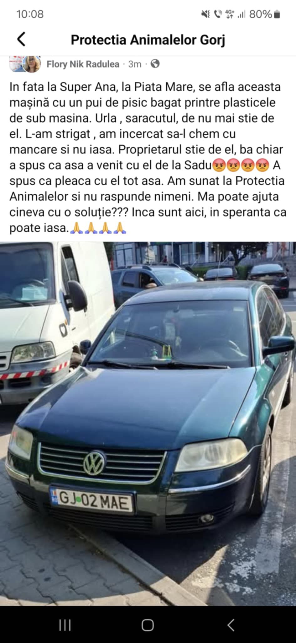 Pisoi salvat din compartimentul motor al unei mașini. Proprietarul știa de micul animal, dar s-a deplasat așa, cu pisoiul la motorul mașinii sale, de la Sadu la Târgu Jiu. În urma unei sesizări primite la Serviciul pentru Protecția Animalelor din cadrul Consiliului Județean Gorj, o echipă a serviciului,  împreună cu reprezentanții Poliției Animalelor din cadrul IPJ Gorj, s-a deplasat astăzi, de urgență, în zona Super 2000 din municipiul Târgu Jiu.