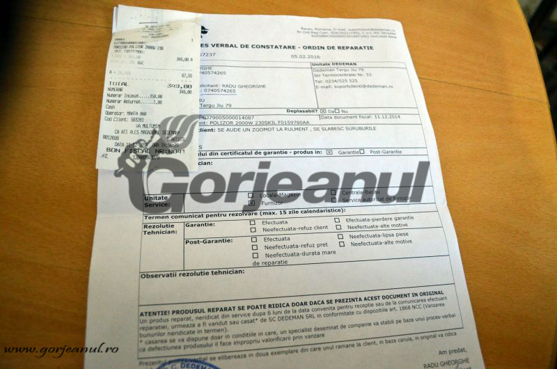 “Am încercat să le explic salariaților de la Dedeman că obiectul este în garanție și este posibil să plătesc reparația lui mai mult decât m-a costat acesta la cumpărare. Respectivii au dat însă din umeri și au spus că eu sunt de vină pentru că l-aș fi suprasolicitat. Eu pot spune că nu am luat polidiscul să îl țin în vitrină, evident că l-am folosit și astfel s-a și stricat. Este însă în garanție și consider că trebuie să primesc obiectul reparat fără să plătesc pentru acesta”, spune Radu Gheorghe care așteaptă ca CJPC Gorj să sancționeze magazinul, iar obiectul său să ajungă la posesor în stare de funcțiune.