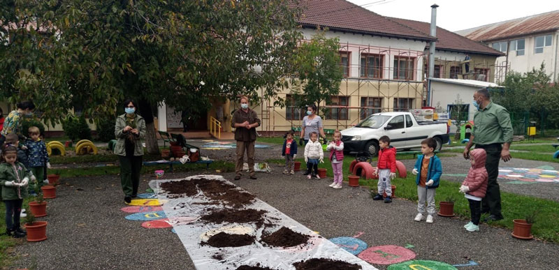 Preșcolari din grupele mijlocii și mari însoțiți de cadre didactice, dotați cu ghivece și mănuși, păstrând bineînțeles regulile de distanțare impuse, împreună cu partenerii noștri, au plantat în ghivece un număr de peste 50 de puieți de brad, pomi care din acestă zi aparțin copiilor care i-au plantat și de care vor trebui să aibă grijă în următoarea perioadă… practic vor „crește împreună cu brăduții” deoarece vârsta celor mai mici dintre participanții la acțiune era aceeași cu vârsta copacilor plantați.