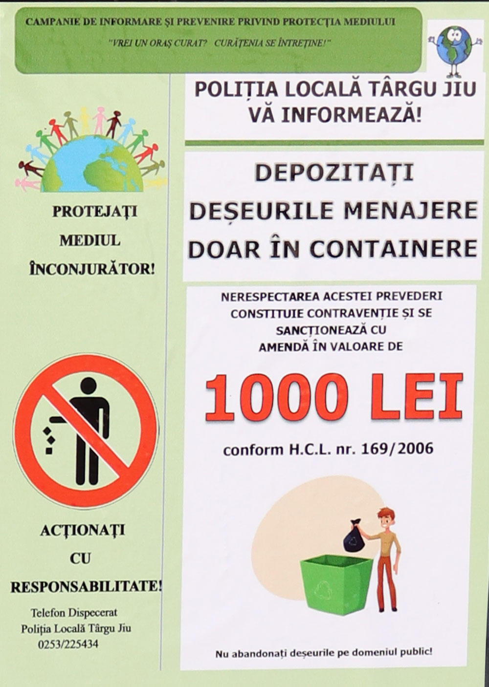 Poliția Locală Târgu Jiu a demarat, în această perioadă, o campanie de informare a cetățenilor în legătură cu depozitarea deșeurilor menajere, dar și a resturilor provenite din construcții sau demolări, în locurile special amenajate. Având în vedere numărul tot mai mare de sesizări legate de mizeria din jurul containerelor de gunoi din cartiere, dar și faptul că multe persoane depozitează, în locuri nepermise, resturi provenite din construcții, cetățenii municipiului Târgu Jiu sunt informați că este interzisă depozitarea molozului pe străzi, trotuare, locuri virane, sau în zonele aferente blocurilor de locuințe. Pentru ridicarea acestor deșeuri trebuie contactat operatorul de salubrizare. Nerespectarea acestei prevederi se sancționează cu amendă în valoare de 1000 de lei. Pe tot parcursul acestei campanii vor fi înmânate materiale informative, afișe și se vor purta discuții cu cetățenii în legătură cu obligațiile pe care le au în ceea ce privește menținerea curățeniei în municipiul Târgu Jiu.