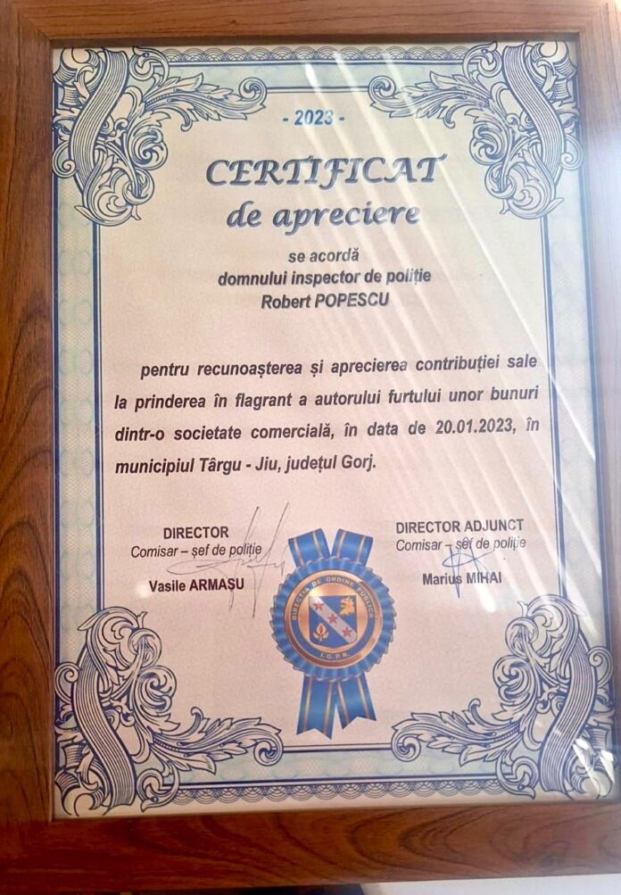 Față de bărbatul urmărit au fost luate măsurile corespunzătoare, dar nici Robert nu a scăpat ,,nepedepsit”. Polițistului i-a fost acordată o plachetă de onoare pe care o păstrează la loc de cinste și spune el că îi amintește să fie mereu un om mai bun ca ieri.