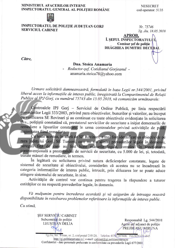 ”În afară de SE Rovinari a mai fost identificat un obiectiv de pe raza județului Gorj, SE Turceni, care nu s-a aliniat prevederilor legale în domeniu, nereguli față de care au fost luate măsurile legale, constând în sancționarea contravențională a prestatorului de servicii de securitate, cu 5000 de lei, și totodată trasate măsuri de remediere, în termen”, a transmis, în scris, agent șef adjunct de poliție Miruna Prejbeanu, purtătorul de cuvânt al IPJ Gorj, cu completarea că acțiunile de control vor continua pentru tragerea la răspundere a tuturor entităților ce nu respectă prevederile legale, în domeniu.