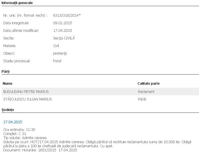 În prezent, există însă un câştigător al primei runde a acestei bătălii pornite la instanţa de fond, adică reclamantul Marius Buduleanu care a apelat la Judecătoria Târgu-Jiu după trei ani şi jumătate în care angajatul IPJ Gorj, spune acesta, nu i-ar fi restituit cei 10.000 de lei împrumutaţi, pe motiv că soţia poliţistului ar fi făcut un accident cu maşina familiei, banii fiindu-i necesari să-şi ducă nevasta la Bucureşti pentru investigaţii medicale. Deşi Stăiculescu a negat şi neagă în continuare că ar fi împrumutat aceşti bani, Buduleanu a reuşit să convingă instanţa de fond că i-a dat banii pârâtului. Judecătoria Târgu-Jiu i-a admis astfel, săptămâna trecută, cererea lui Buduleanu, obligând pârâtul “să restituie reclamantului suma de 10.000 de lei”. Mai mult, Stăiculescu trebuie să achite şi cheltuielile de judecată în sumă de 100 de lei ale celui care l-a dat în judecată.