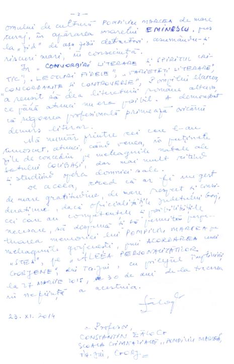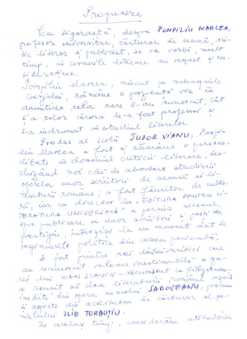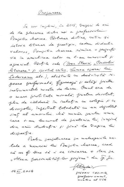 profesorului şi scriitorului Pompiliu Marcea să i se consacre o stea pe “Aleea personalităţilor gorjene” din municipiul Târgu-Jiu, propuneri pe