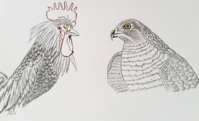 Zilele treceau senine… însă această rutină avea să se schimbe curând… Într-o dimineață, moș Tănase numai ce dăduse de mâncare la păsări și intrase în magazie să mai facă puțină curățenie… Cerul era albastru, fără nor… Un vânt ușor înfiora frunzele… Deodată, cocoșul cel bătrân dădu glas… fu urmat, aproape imediat, de cei mai tineri… Strigătele lor ascuțite sparseră tihna de până atunci… Pericolul își făcuse apariția… Din pădurea aflată în apropierea satului, zburând razant la vârful coroanei pomilor, un uliu zărise păsăretul care ciugulea fericit și hotărâse a-și încerca norocul de a prinde în gheare o pasăre neatentă… Se așezase într-un pom, nu departe, și studiase – cu ochii lui mari, galben-portocalii, terenul… potențialele victime… Apoi, neauzit, își luase zborul și se aruncase fulgerător, venind în jos ca o piatră… Găinile fugiră care-ncotro… una mai bătrână și mai vulnerabilă era ținta sa…