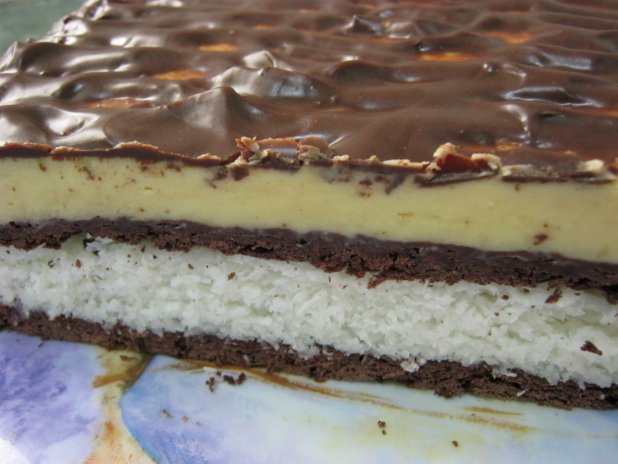 Se freacă untul, smântâna cu făina, praful de copt, zahărul şi cacao. Se obţine un aluat pe care îl împărţim în două. Se întinde din aluat prima foaie pe hârtie de copt, iar din aluatul rămas se face a doua foaie. Aceasta trebuie pusă peste umplutura de cocos.