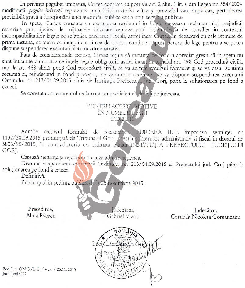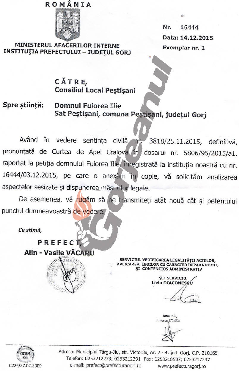 Printr-o adresă scrisă, transmisă joi Prefecturii Gorj, de către un executor judecătoresc, instituţia condusă de Alin Văcaru este executată silit. Totul, deoarece, Prefectura a refuzat să pună în aplicare ultima hotărâre judecătorească definitivă obţinută de alesul din Peştişani, Ilie Fuiorea. Curtea de Apel Craiova s-a pronunţat pe 25 noiembrie în litigiul lui Fuiorea cu Prefectura Gorj, şi i-a dat câştig de cauză viceprimarului de Peştişani, dispunând suspendarea executării ordinului prefectului Văcaru, din 4 septembrie 2015. Prin acest ordin se dispusese ca Fuiorea să fie detronat din funcţia de conducere de la Primăria Peştişani, documentul fiind acum anulat de instanţă.