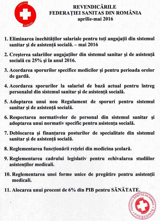 de Federaţia SANITAS, atât cu Ministerul Sănătăţii, cât şi cu Ministerul Muncii, Familiei, Protecţiei Sociale şi Persoanelor Vârstnice. Joi, 14 aprilie 2016, Consiliul Naţional al Federaţiei SANITAS din România a hotărât să demareze un amplu program de acţiuni sindicale în cazul în care revendicările SANITAS nu sunt rezolvate de autorităţile statului. Federaţia SANITAS din România atrage atenţia Guvernului României că sectorul sanitar este lăsat să se zbată între lipsa dotărilor şi cea a personalului de specialitate, insuficient pentru acest sistem atât de important, dar lăsat sau chiar încurajat în continuare să emigreze.