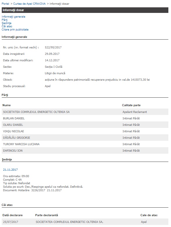 Complexul Energetic Oltenia a pierdut apelul declarat, anul trecut, împotriva celor șase foști directori și juriști ai companiei pentru a recupera un presupus prejudiciu de 1.415.073,30 de lei. De altfel, CEO a pierdut inițial fondul pe motiv că fapta s-a prescris, dar a continuat litigiul împotriva lui Daniel Burlan, Daniel Olaru, Nicolae Viașu, Grigorie Dădălău, dar și împotriva Narcisei Luciana Turony și a lui Ion Dafinoiu. Sentința este definitivă, iar prejudiciul imposibil de recuperat.