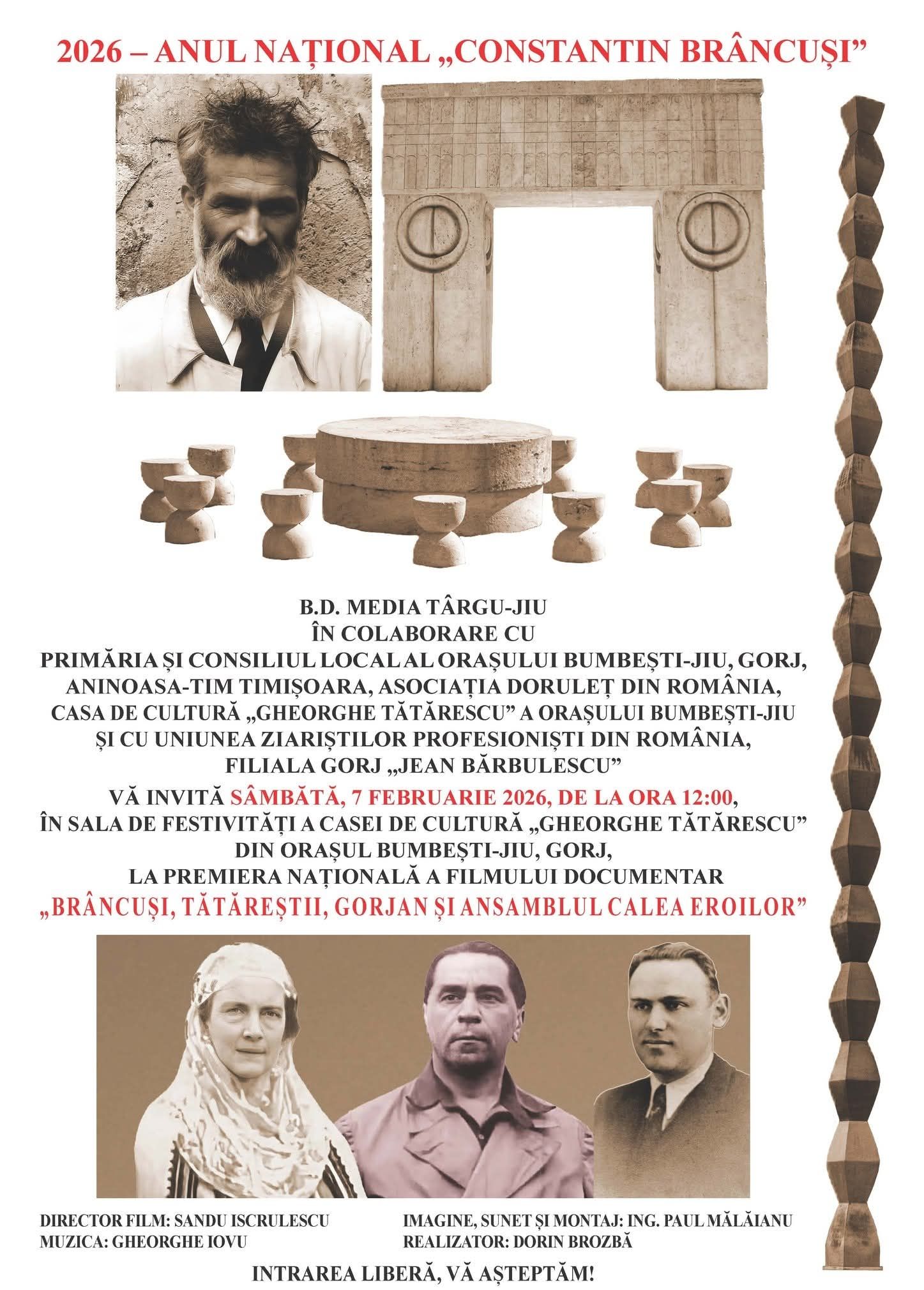 Sâmbătă, 7 februarie 2026, de la ora 12:00, la Casa de Cultură „Gheorghe Tătărescu” din Bumbești-Jiu, va avea loc premiera națională a filmului documentar „Brâncuși, Tătăreștii, Gorjan și Ansamblul Calea Eroilor”. Evenimentul este organizat de B.D. Media Târgu-Jiu, în colaborare cu Primăria și Consiliul Local Bumbești-Jiu, Aninoasa–Timișoara, Asociația Doruleț din România, Casa de Cultură „Gheorghe Tătărescu” și Uniunea Ziariștilor Profesioniști din România – Filiala Gorj „Jean Bărbulescu”.