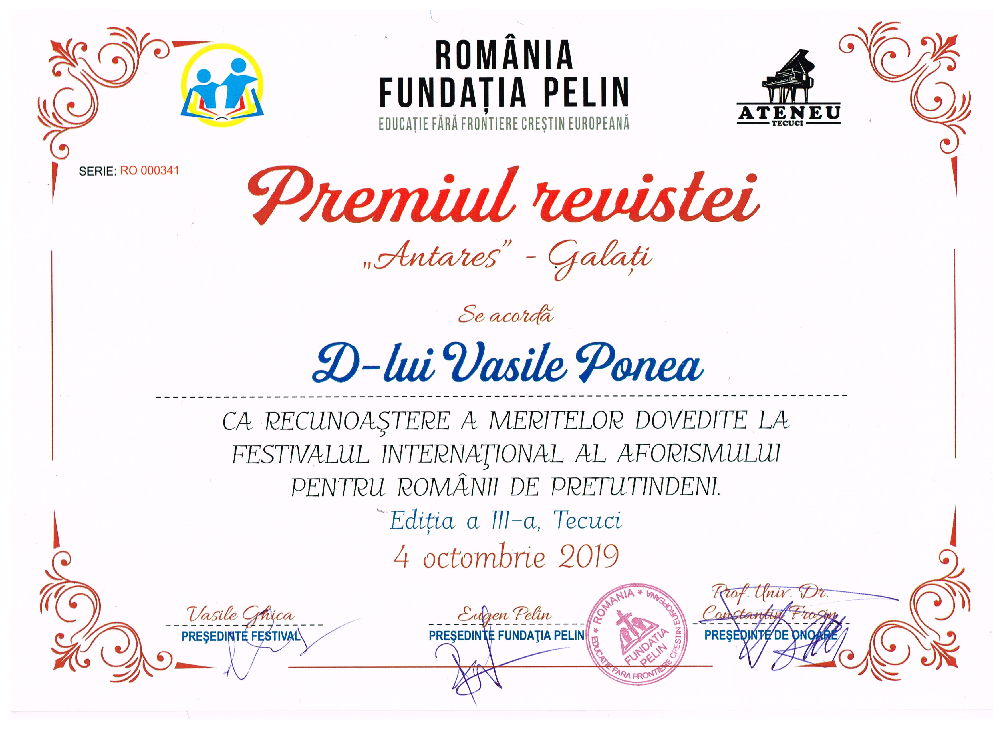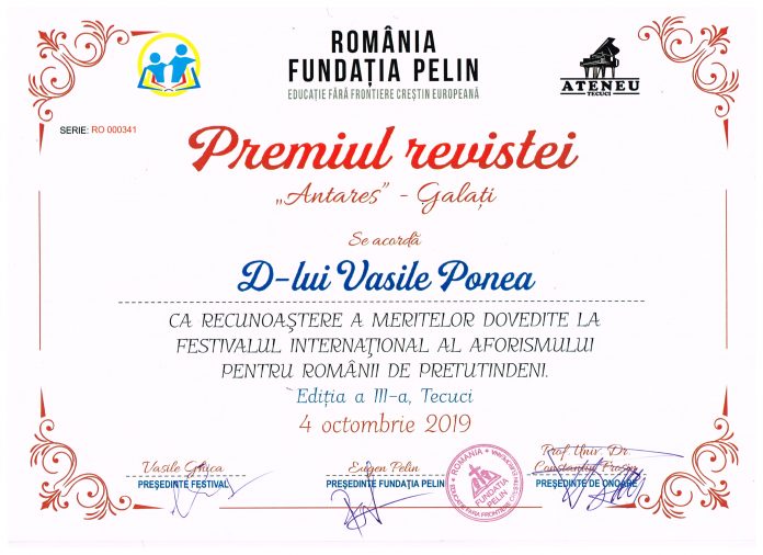 La prima ediţie, din 2017, participase academicianul Naji Naaman, scriitor libanez şi manager cultural de talie universală, care a şi tipărit la Beirut, în şase limbi, în trei mii de exemplare, difuzându-l ulterior în mai multe ţări, volumul „Gânduri desenate”, realizat de elevii tecuceni. La ediţia a doua – dedicată Centenarului Marii Uniri, au venit alţi doi academicieni: N. Dabija din Basarabia şi Ioan-Aurel Pop, preşedintele Academiei Române. Însă premiaţii au fost şi din Canada, SUA, Franţa, Israel şi Republica Moldova. La cea de-a treia ediţie a sosit, de la Universitatea Sorbona din Paris, François Vaucluse, considerat cel mai valoros urmaş al lui Ferdinand de Saussuse, întemeietorul structuralismului universal.
