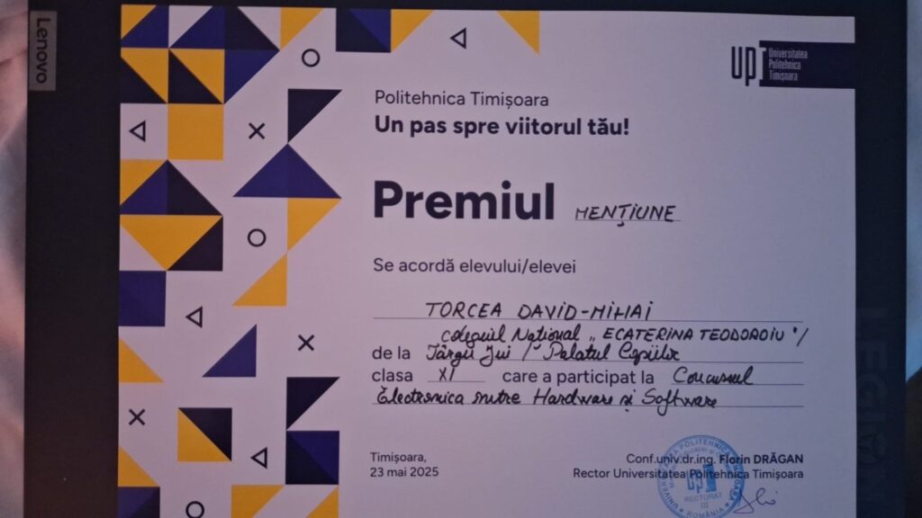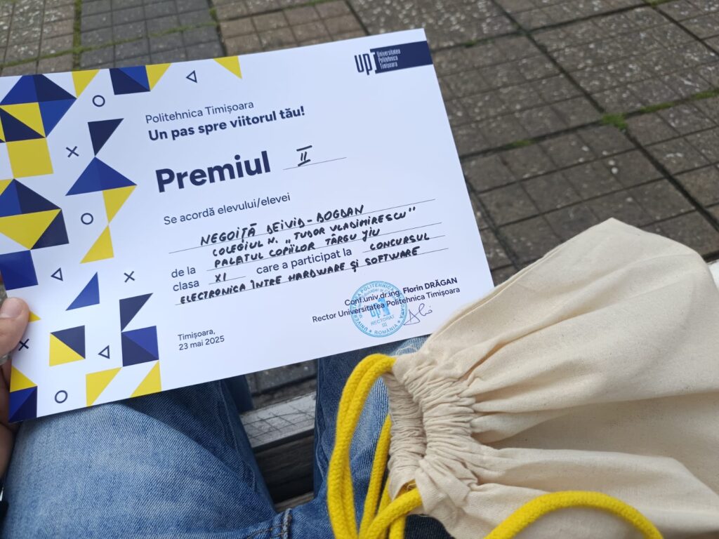 Doi elevi din Târgu Jiu au obținut premii importante la concursul național „Electronica, între hardware și software”, organizat sub egida Universității Politehnica Timișoara și dedicat liceenilor pasionați de electronică, robotică și automatizări.