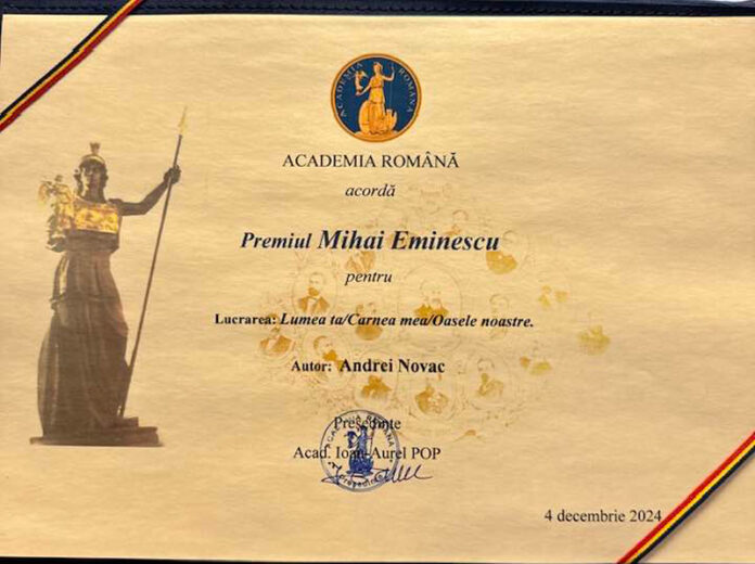 Scriitorul Andrei Novac, născut la Târgu Jiu în 1983, a primit Premiul „Mihai Eminescu” pentru volumul de poezie „Lumea mea/ Carnea ta/ Oasele noastre”, publicată la Editura Litera. „Primirea premiului Mihai Eminescu constituie o mare bucurie, dar și o mare responsabilitate. Mulțumesc celor care au susținut cartea pentru obținerea acestui premiu și Academiei Române pentru onoarea pe care mi-a făcut-o”, a declarat Andrei Novac.