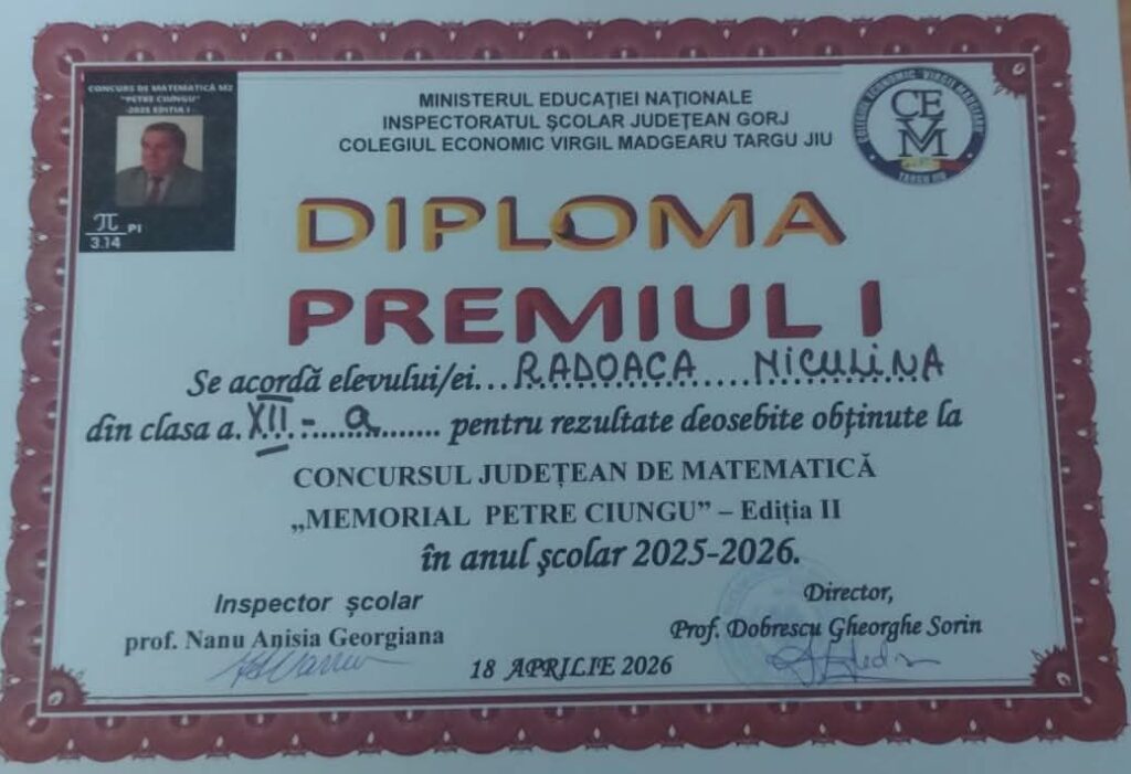 Eleva noastră, Niculina Radoaca, a obținut Premiul I la Concursul Județean de Matematică „Memorialul Petre Ciungu”, reușind un punctaj aproape de maxim (27 din 30 de puncte).