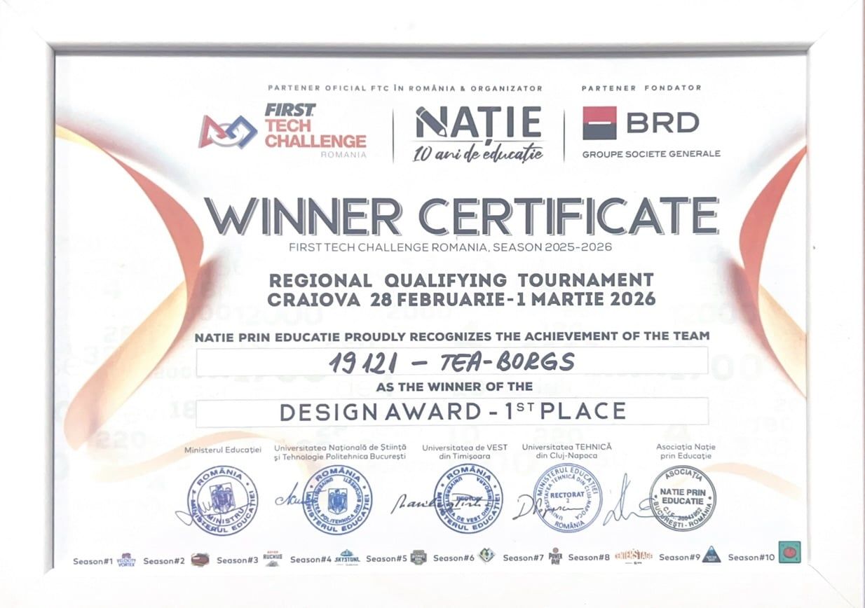 Echipa de robotică Tea-Borgs a Colegiului Național „Tudor Vladimirescu” din Târgu Jiu a obținut Premiul I – Design Award la etapa regională First Tech Challenge desfășurată la Craiova, calificându-se astfel la Campionatul Național de Robotică 2026.