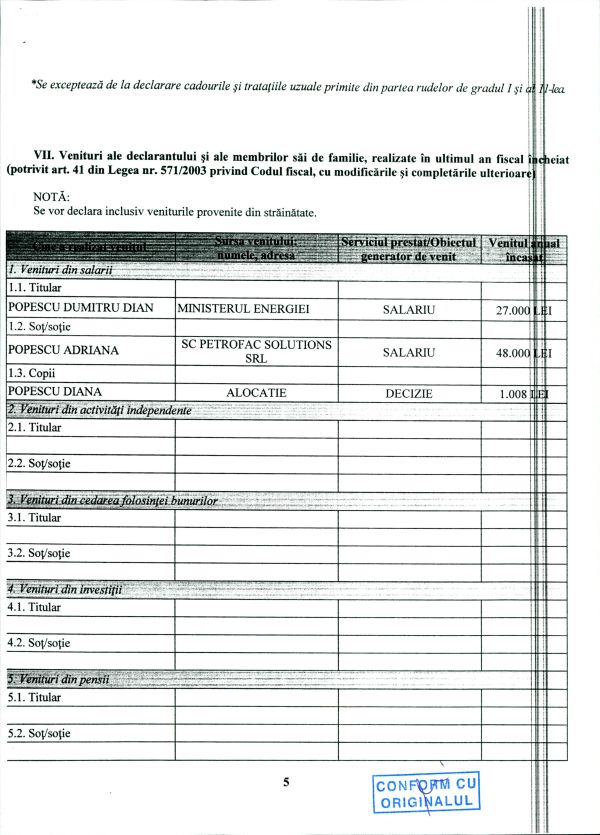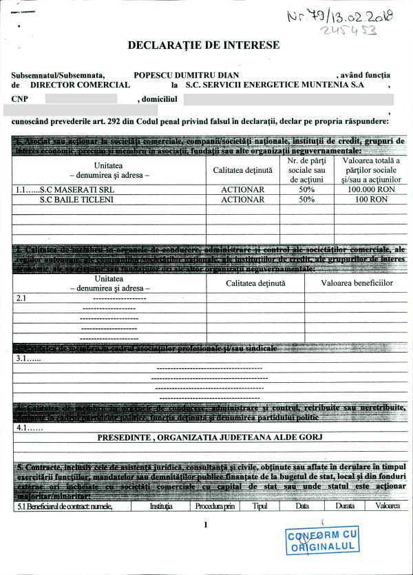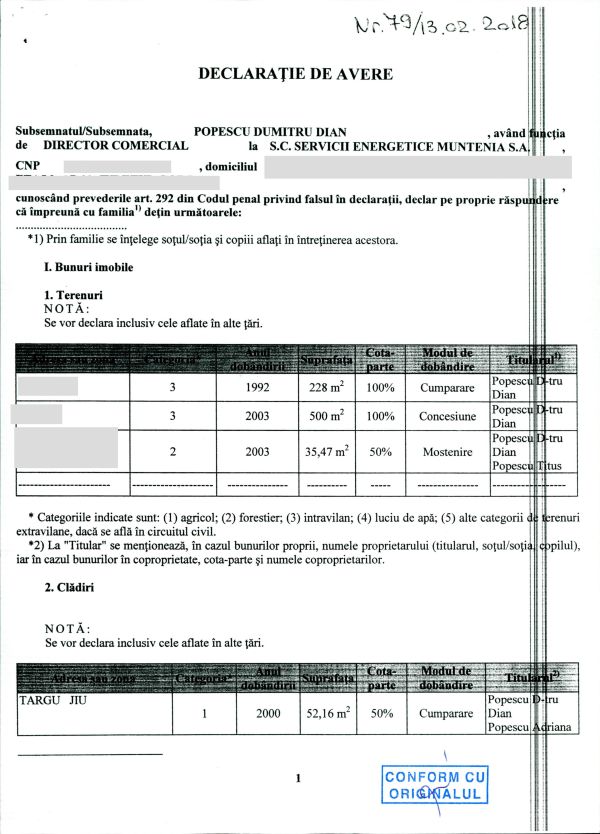 adevărată, că nu își dorește nicio slujbă la Electrica, că nu renunță la șefia partidului, deoarece nu aspiră la nicio funcție de conducere la vreo societate de stat. Declarațiile de avere și interese ale lui Dian Popescu, scrise cu mâna sa și datate 12 februarie 2017, înregistrate în februarie 2018 odată cu angajarea la Electrica SA-SC Servicii Energetice Muntenia SA, îl contrazic pe politrucul care a