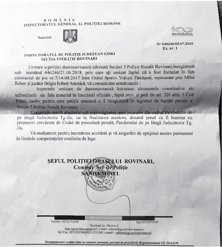 Documentul eliberat de șeful Poliției Rovinari, pe 5 iulie, arată clar că Mihai Robert, președintele acestui club de fotbal, nu conduce acest for respectând prevederile legale. O spun doi foști sportivi ai CS Vulturii Fărcășești, unuia cerându-i-se bani pentru a putea activa la un alt club, iar celălalt trezindu-se că are un contract cu clubul, realizat în fals de respectivul. Robert Belgiu, cel care l-a reclamat pe Mihai Robert la poliție, susține că nu va da înapoi și va aștepta rezoluția procurorului de caz, considerând că ar fi fost prejudiciat de șeful clubului de fotbal.