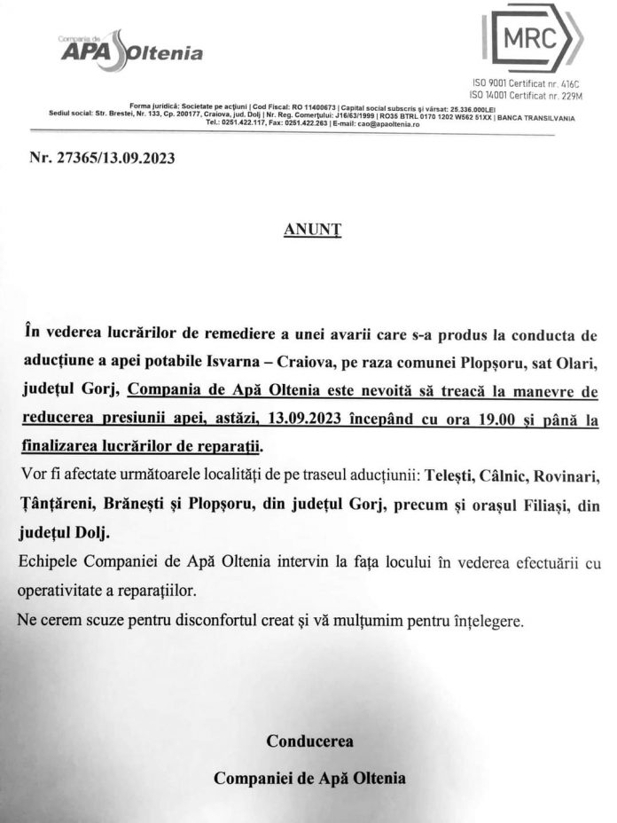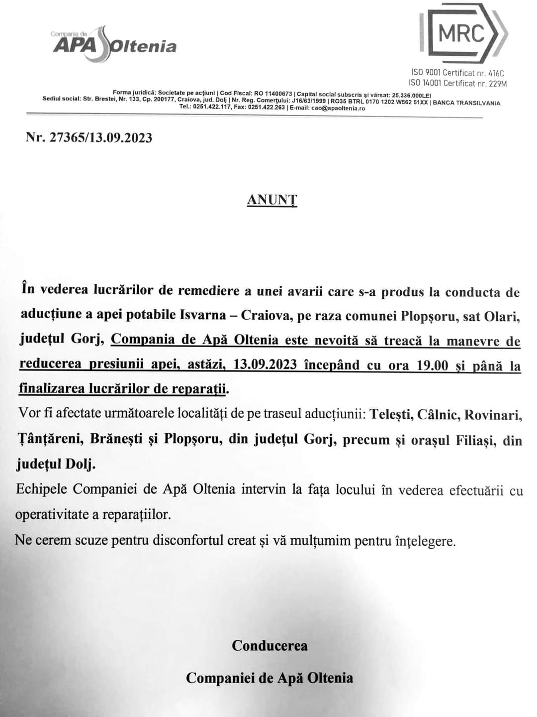 6 localități din Gorj se confruntă cu presiune scăzută a apei de la robinete, ca urmare a unei avarii produse pe raza comunei Plopşoru. Anunțul a fost făcut de conducerea Companiei de Apă Oltenia.