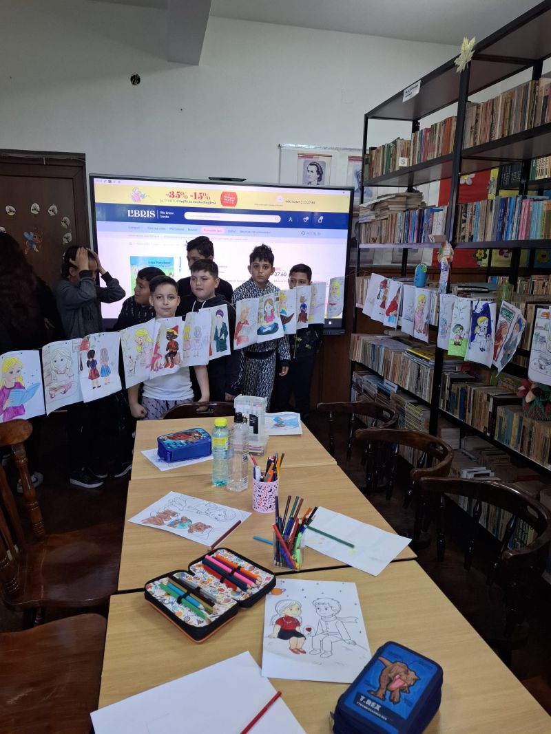 Inspirați din cartea citită, elevii au realizat desene pe care mai apoi le-au expus într-o manieră inedită, pe o… sfoară. Și astfel, am umplut sfoara cu desene, în culorile imaginației copiilor, impresionând de la mic la mare pe toți cei ce au călcat pragul bibliotecii.