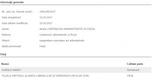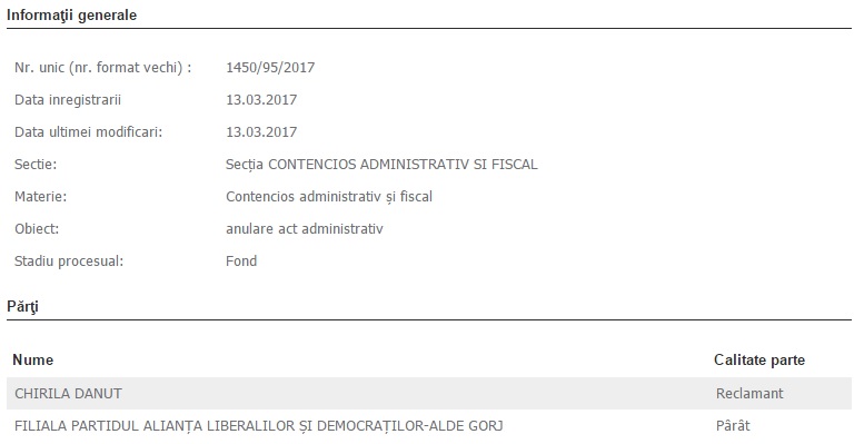 Nu numai Daniel Constantin, copreședintele ALDE, se pregătește să conteste în instanță legalitatea Delegaţiei Permanente a partidului, întrunită în vederea convocării congresului extraordinar al ALDE, ci a făcut-o, cu o săptămână în urmă, și un lider al alianței liberalilor și democraților de la Gorj. Dănuț Chirilă, prim-vicepreședinte al ALDE Gorj, provenit din aripa PC, cere la Tribunalul Gorj, prin două procese distincte, atât anularea actului administrativ respectiv, cât și suspendarea executării acestuia. Este de notorietate, de altfel, că Delegația Permanentă a ALDE Gorj, întrunită în februarie la Târgu-Jiu de către copreședintele Dian Popescu, a stârnit nemulțumiri în organizație, mai ales din partea foștilor conservatori.