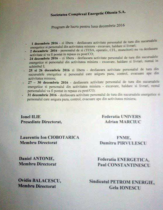 Lucrurile nu s-au complicat nici când s-a discut despre programul de lucru, în care s-a stabilit că angajații CEO vor fi liberi pe 30 noiembrie și 1 decembrie, ca pe 2 decembrie să lucreze numai personalul din producție, adică cei care dau cărbune sau steril. Personalul TESA și mentenanța nu vor presta, ci vor beneficia fie de o zi de concediu de odihnă, fie de recuperare.