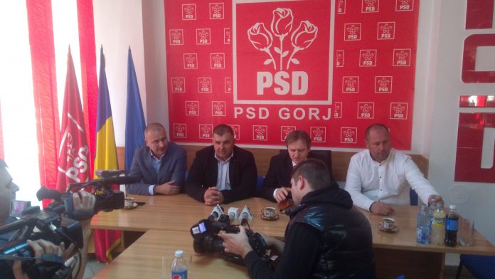 Primarul ALDE de la Drăguțești, Ion Popescu, participa la sediul PSD Gorj la conferința săptămânală. Popescu este flancat de Mihai Weber și de Mihai Popescu, în prezidiul conferinței.
