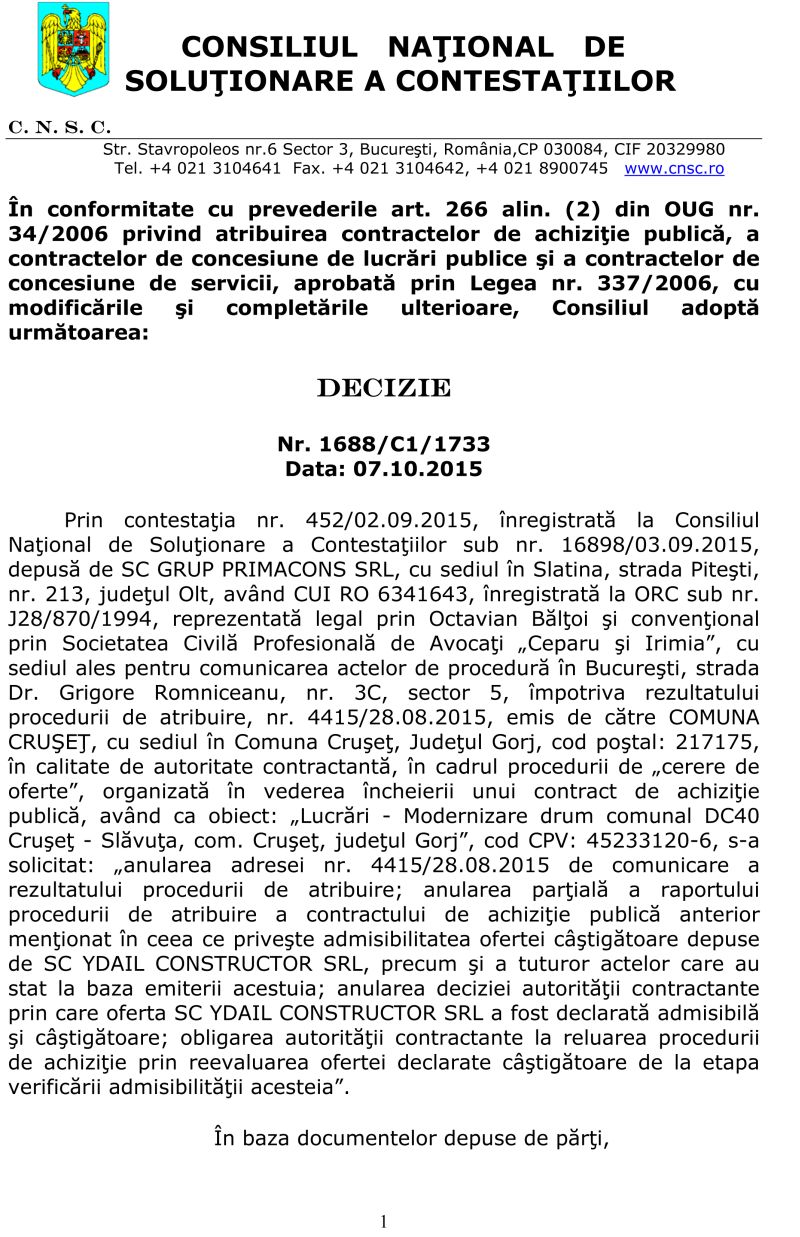 Octavian Bălţoi, administratorul firmei, a contestat însă licitaţia la CNSC, cerând “anularea parţială a raportului procedurii de atribuire a contractului de achiziţie publică anterior menţionat în ceea ce priveşte admisibilitatea ofertei câştigătoare depuse de SC Ydail Constructor SRL, precum şi a tuturor actelor care au stat la baza emiterii acestuia; anularea deciziei autorităţii contractante prin care oferta SC Ydail Constructor SRL a fost declarată admisibilă şi câştigătoare; obligarea autorităţii contractante la reluarea procedurii de achiziţie prin reevaluarea ofertei declarate câştigătoare de la etapa verificării admisibilităţii acesteia”.