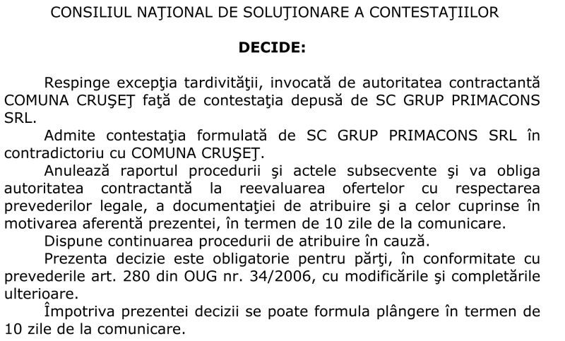 Prin decizia din 7 septembrie, CNSC admite contestaţia Grup Primacons SRL şi “anulează raportul procedurii şi actele subsecvente” obligând autoritatea contractantă la reevaluarea ofertelor cu respectarea prevederilor legale, a documentaţiei de atribuire şi a celor cuprinse în Motivarea în cauză, în termen de zece zile de la comunicare. Totodată CNSC dispune continuarea procedurii de atribuire în cauză, lucru aflat recent de primarul localităţii Viorel Drăguşin. “Am auzit marţi de răspunsul CNSC-ului care ne obligă să întrunim iar comisia de licitaţie şi să stabilim din nou un câştigător. Vom face asta deşi totul nu înseamnă decât o întârziere pentru noi. Licitaţia se va relua, apoi vom aştepta perioada de contestaţie, şi constructorul se va apuca de drum în plină iarnă. Stăm cu banii blocaţi şi cu lucrarea în aşteptare pentru că preţul oferit de cele două firme a fost foarte apropiat”, a declarat primarul Drăguşin.