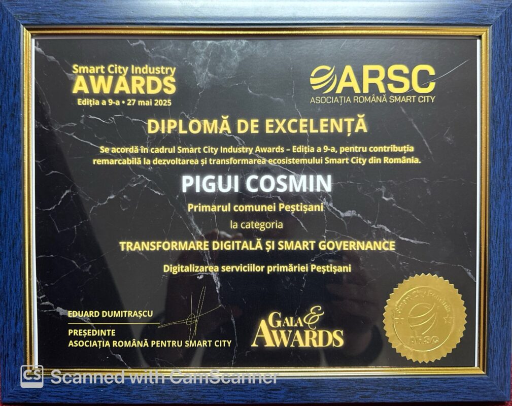 Primăria Peștișani, premiată pentru excelență în digitalizare, la Gala Smart City Industry Awards 9, organizată de ARSC.
