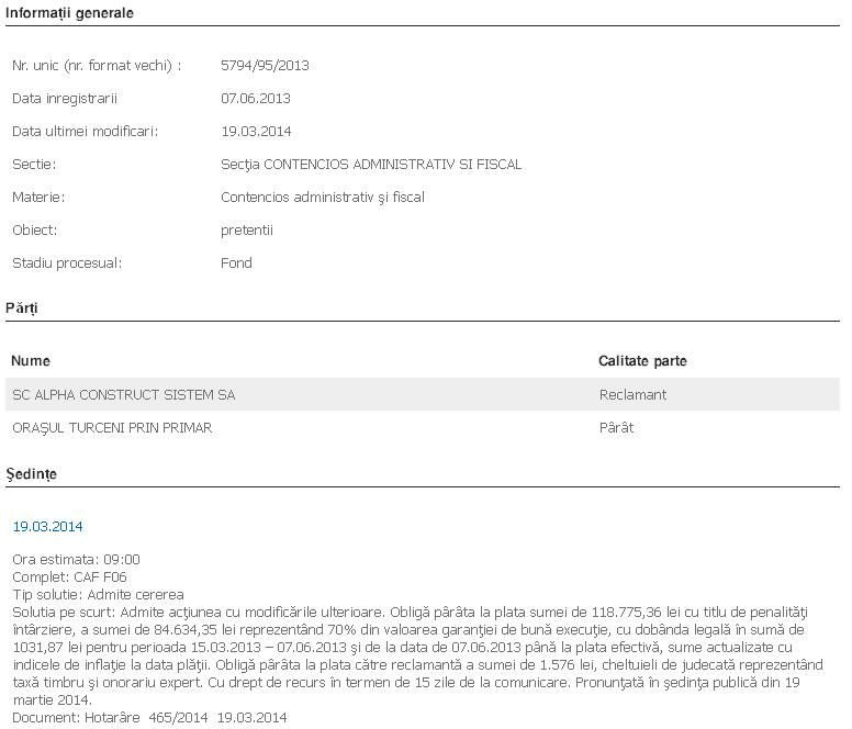 Instanţa admite astfel acţiunea Alpha Construct împotriva Primăriei Turceni, cu modificările ulterioare.