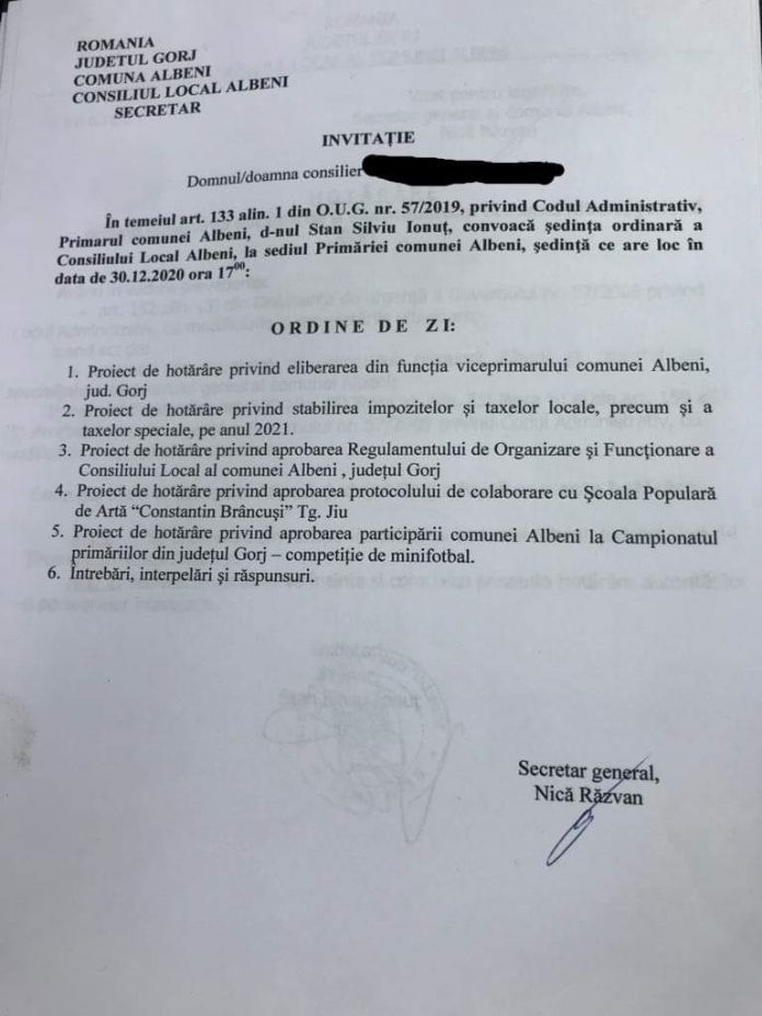 Viceprimarul Cristian Țârcomnicu de la PNL ar putea fi schimbat din funcție. O cere chiar primarul comunei Albeni, Ionuț Stan, în ședința de Consiliu Local de mâine. Nu se cunoaște de ce edilul nu mai vrea să facă echipă cu colegul său de partid, dar, cert este că nu îl mai vrea la cârma primăriei.