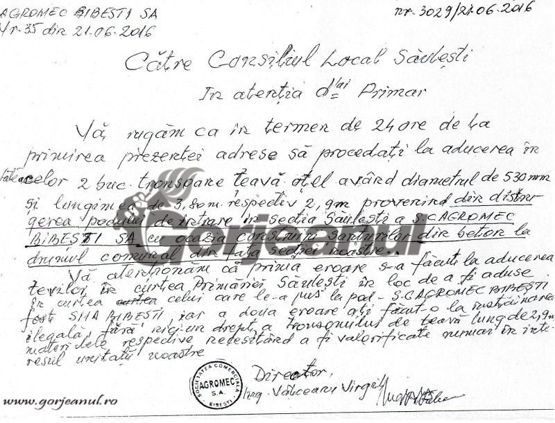 bază. “Mai mult, țeava veche a fost dusă de constructor în curtea Primărei Săulești de unde a și dispărut câteva luni mai târziu”, a menționat Vîlceanu, care a solicitat, în scris, în 2016, instituției publice, restituirea vechii țevi. Nici în ziua de azi nu a primit un răspuns solicitării acestuia. Pe parcursul anchetei, se mai constată de către polițist, că, în 2010, lucrări de canalizare s-au efectuat și de către SC TECOND SRL Craiova, beneficiar fiind tot primăria comunei, cu această ocazie fiind rupt, cu cupa excavatorului, cablul electric trifazat care a aparținut AGROMEC Bibești. Acest lucru este trecut în referatul agentului, care subliniază că Vîlceanu a făcut o plângere, la acel moment, împotriva constructorului din Craiova, dar și-a retras plângerea. Polițistul nu explică și de ce reclamantul și-a retras plângerea, deoarece în declarația lui Vîlceanu acesta scrie clar că va renunța la demers doar în condițiile în care paguba va fi remediată.