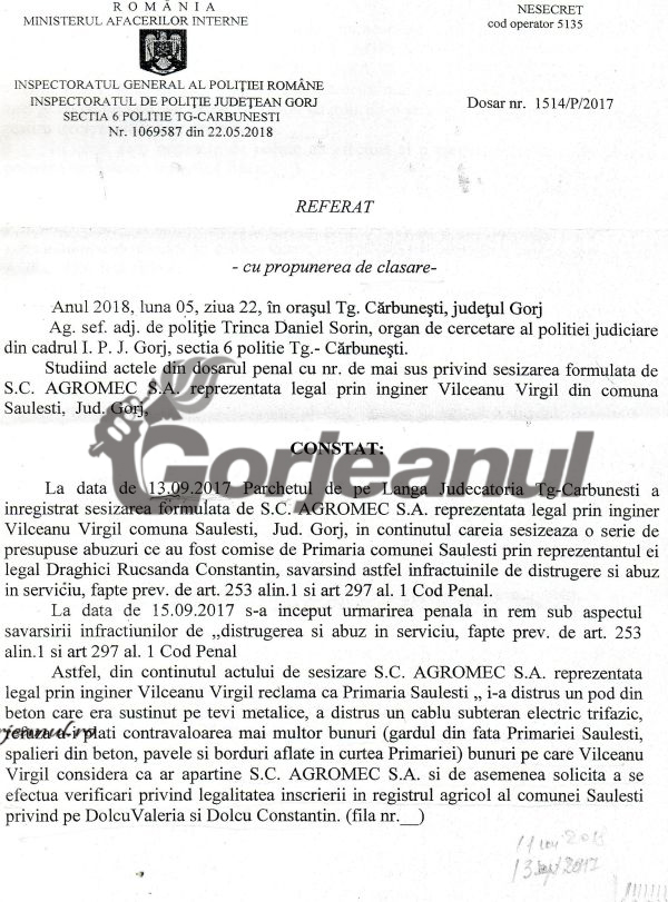 Procurorii Parchetului de pe lângă Judecătoria Târgu-Cărbunești au în lucru, din septembrie 2017, un dosar penal care are la bază plângerea penală făcută de ing.Virgil Vîlceanu,