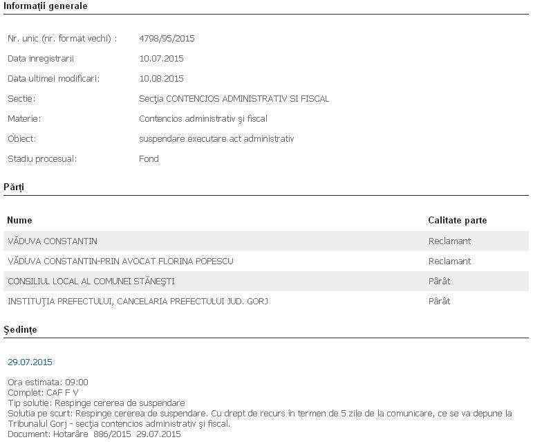 Astfel, deşi este destituit în iunie, abia pe 10 iulie Văduva se adresează Tribunalului Gorj cu o cerere de suspendare de executare a actului administrativ. Deja la al doilea termen, Văduva pierde procesul cu Consiliul Local Stăneşti şi cu Instituţia Prefectului, instanţa stabilind să respingă cererea fostului viceprimar pe 29 iulie. Abia pe 6 august Văduva face recurs, instanţa nestabilind încă un termen în acest proces.