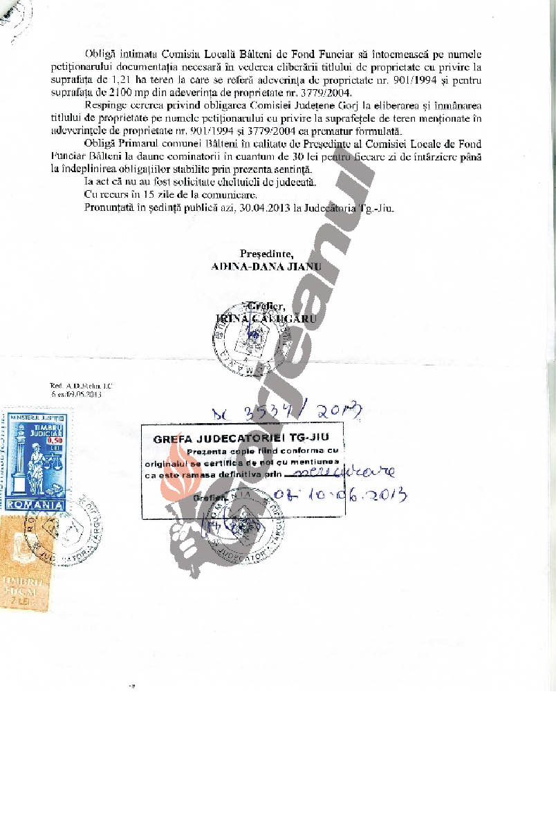 Acelaşi document stabileşte în cuprinsul sentinţei că edilul în exerciţiu din Bîlteni, aflat acum în arest la domiciliu pentru evaziune fiscală şi spălare de bani, este obligat “în calitate de Preşedinte al Comisiei Locale de Fond Funciar Bâlteni la daune cominatorii în cuantum de 30 de lei pentru fiecare zi de întârziere până la îndeplinirea obligaţiilor stabilite de prezenta sentinţă”.
