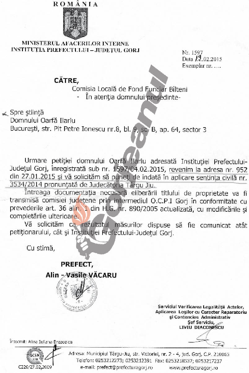 “Am cheltuit milioane ca să îmi fac dreptate în instanţă pe un lucru al familiei mele şi pentru a face drumuri ca să îmi fie pus în aplicare un drept astfel câştigat. Am purtat mai multe discuţii cu primarul de Bîlteni şi cu alţi funcţionari, am făcut trei drumuri cu delegatul primăriei la OCPI Gorj, pe cheltuiala mea, dar nici până în prezent nu mi s-a eliberat titlul revendicat. Deţin nenumărate adrese de la Prefectura Gorj spre Primăria Bîlteni în care prefectul Alin Văcaru atenţiona autorităţile locale să respecte hotărârea judecătorească şi să îmi elibereze titlul cerut. Nici acest demers al prefectului judeţului nu a putut să treacă de nepăsarea şi abuzul în serviciu de care a dat şi dă dovadă atât primarul Păsărin, cât şi unii subordonaţi ai săi, mă refer la Florina Măceşanu, referent în cadrul Compartimentului Agricol al primăriei. Poate că acum, când s-a văzut de ce este capabil edilul şi echipa sa o să mi se pună în aplicare, în sfârşit, hotărârea deţinută, asta dacă nu, între timp, Poliţia Rovinari va finaliza, în sfârşit, cercetarea penală deschisă cu patru luni în urmă împotriva primarului Păsărin”, a declarat Ilariu Oarfă.
