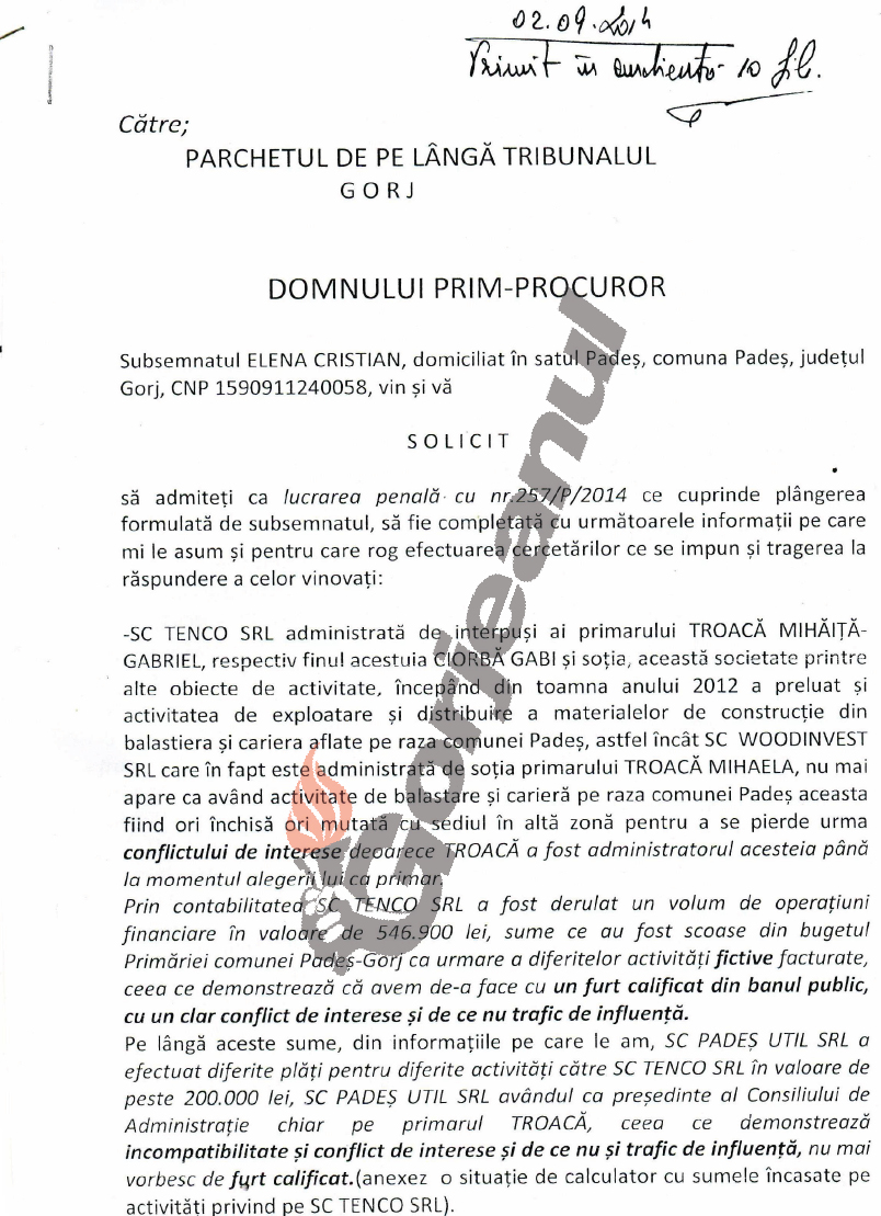 Edilul local PDL din Padeş, Mihăiţă Troacă, este cercetat, din vara acestui an, de procurorii Parchetului de pe lângă Tribunalul Gorj într-un nou dosar de corupţie. De data aceasta, edilul care pentru a scăpa de acuzaţii este dornic să treacă, cu noua ordonanţă, la PSD, este cercetat pentru evaziune, furt din banul public, trafic de influenţă şi conflict de interese. Fostul viceprimar al localităţii, Cristian Elena, i-a făcut plângerea penală în cauză edilului local, demonstrând procurorului de caz că fostul său partener de echipă ar fi prejudiciat bugetul local cu aproximativ 10 miliarde de lei vechi.