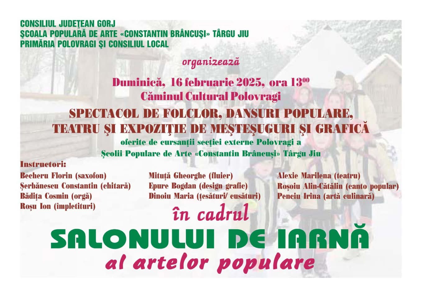 „Primăvara Tradițiilor la Polovragi – Dragobetele și Mărțișorul în ritm de folclor! Dragi iubitori ai tradițiilor românești, vă invităm să sărbătorim împreună frumusețea obiceiurilor noastre strămoșești la un eveniment special, ce aduce mai aproape spiritul Dragobetelui și farmecul Mărțișorului! Salonul de Iarnă al Artelor Populare – un spectacol de folclor, dansuri populare, teatru, expoziții de meșteșuguri și grafică!.Elevii Școlii Populare de Arte „Constantin Brâncuși” din Târgu Jiu, secția externă Polovragi, alături de instructorii lor, vă pregătesc momente pline de emoție, culoare și tradiție! Fie că iubim Dragobetele, sărbătoarea dragostei autohtone, sau așteptăm cu drag Mărțișorul ca simbol al primăverii, acest eveniment ne oferă ocazia de a ne bucura de frumusețea datinilor românești! Vă așteptăm cu sufletul deschis și dor de tradiție!”, au transmis, pe rețelele sociale, reprezentanții Primăriei Polovragi.