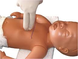 -dacă manevra nu dă rezultate, se întoarce copilul cu fața în sus și se apasă cutia toracică cu două degete la o lățime de deget sub o linie imaginară ce unește mameloanele, apăsarea făcându-se în jos și înainte spre cap.