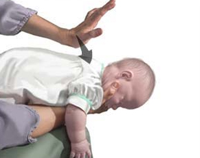 -se așează sugarul cu fața în jos sprijinit pe antebrațul salvatorului, susținându-i-se bărbia cu mâna și se aplică lovituri pe spate cu palma, între omoplați. Loviturile trebuie să fie mult mai blânde decât în cazul unui adult.