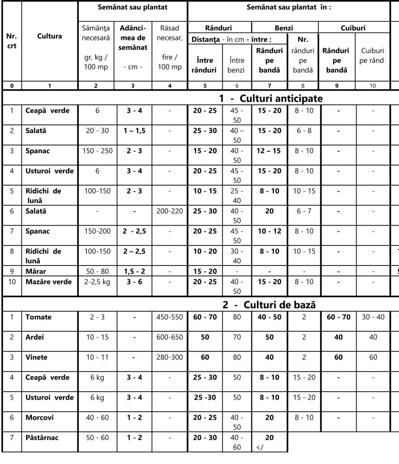 Cred că este mult mai util pentru dumneavoastră să concentrez sub formă de tabel cele mai importante date de tehnologie a legumelor pentru grădinile familiale, și nu numai, comparative cu modul, „articol” unde comentariul ocupă cel mai mare spațiu. Trebuie să-mi cer însă scuze pentru dimensiunea redusă a caracterelor, impusă de coloanele înguste, dar mi-am propus să vă pun la dispoziție într-un spațiu cât se poate de mic un volum cât mai mare de informații utile. Cred că astfel puteți intra mult mai ușor în posesia informațiilor tehnice de care veți avea nevoie și vă veți putea planifica, eșalona ușor producerea de legume proaspete proprii, astfel ca să vă bucurați de ele tot timpul anului fără a vă fi specializat anticipat. Urmând întocmai indicațiile din acest tabel vă veți surprinde vecinii și prietenii cu o grădină de legume armonioasă și cu faptul că exploatând corect o porțiune cât de mică de teren vă puteți asigura legumele proaspete necesare, dar mai ales sănătoase, nepoluate de chimia agricolă. Totodată, veți ști și