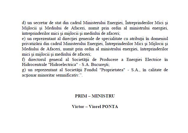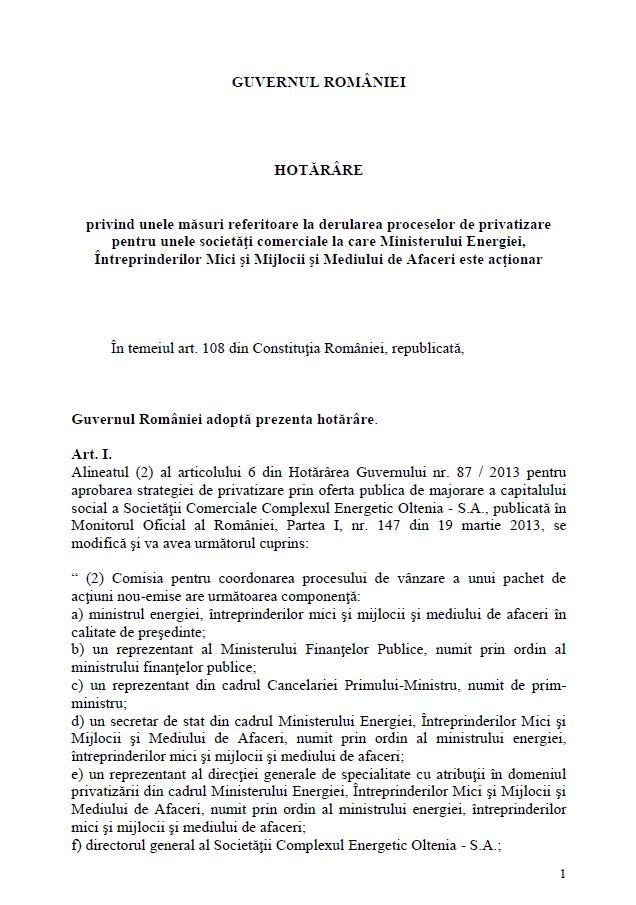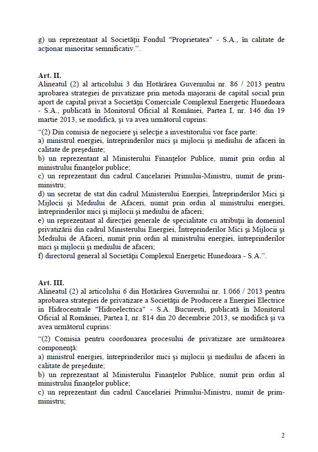 Ministrul Energiei va fi președintele comisiilor pentru privatizarea Complexului Energetic Oltenia, Complexului Energetic Hunedoara și companiei Hidroelectrica, potrivit unui proiect de hotărâre privind componența comisiilor pentru coordonarea procesului de vânzare a unor pachete de acțiuni la unele companii la care Ministerul Energiei, a postat pe 13 ianuarie 2015, pe pagina de internet a ministerului. Hotărârea privind unele măsuri referitoare la derularea proceselor de privatizare pentru unele societăți comerciale la care Ministerul Energiei, Întreprinderilor Mici și Mijlocii și Mediului de Afaceri este acționar face referire la strategia de vânzare pentru cele trei structuri.