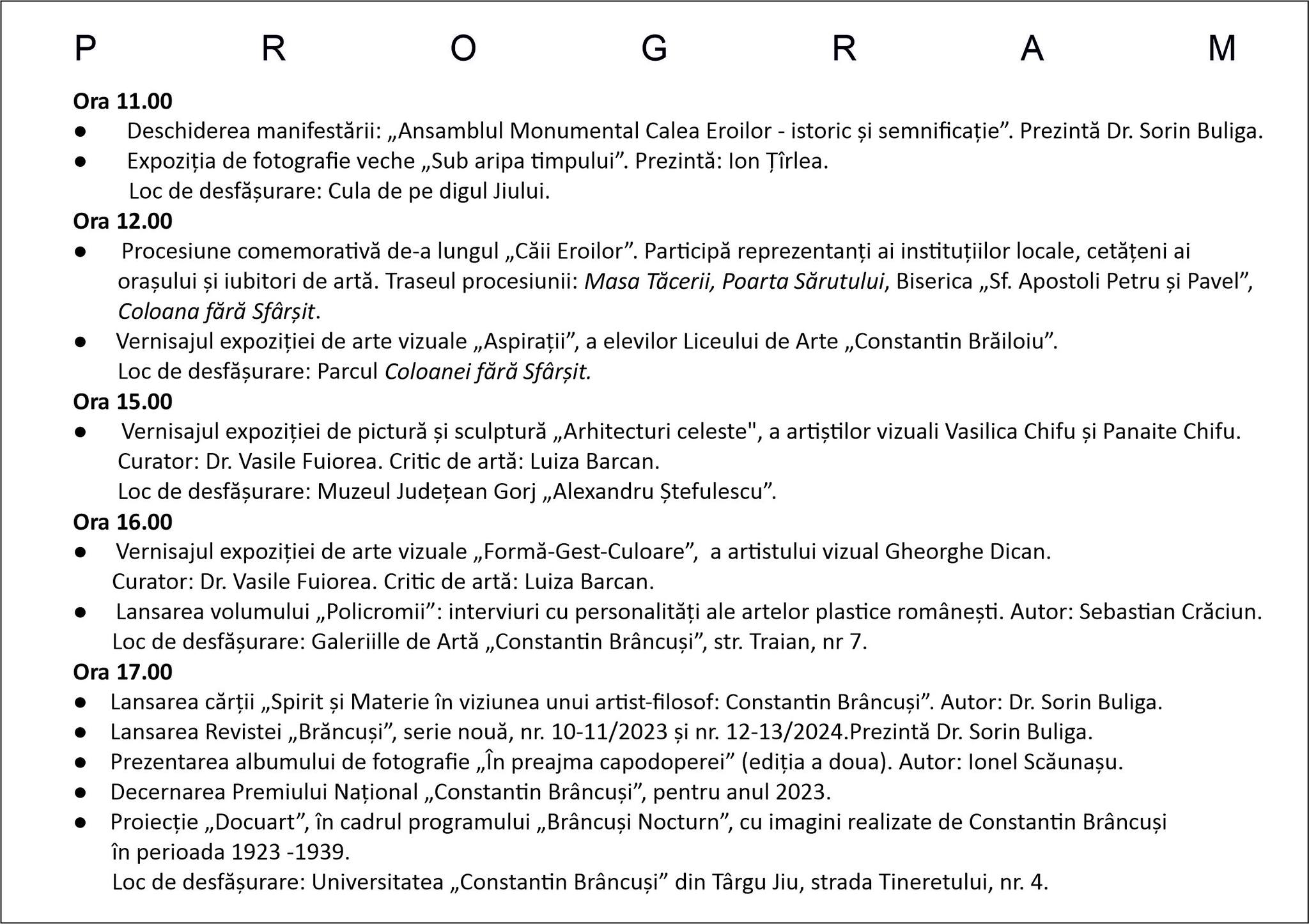 - Procesiune comemorativă de-a lungul „Căii Eroilor”. Participă reprezentanți ai instituțiilor locale, cetățeni ai orașului și iubitori de artă. Traseul procesiunii: Masa Tăcerii, Poarta Sărutului, Biserica „Sf. Apostoli Petru și Pavel”, Coloana fără Sfârșit.