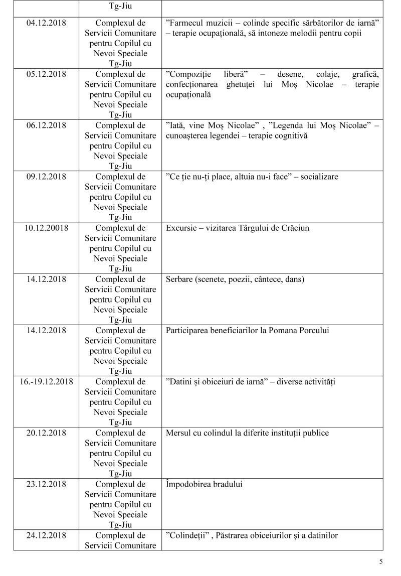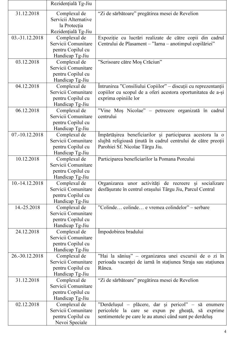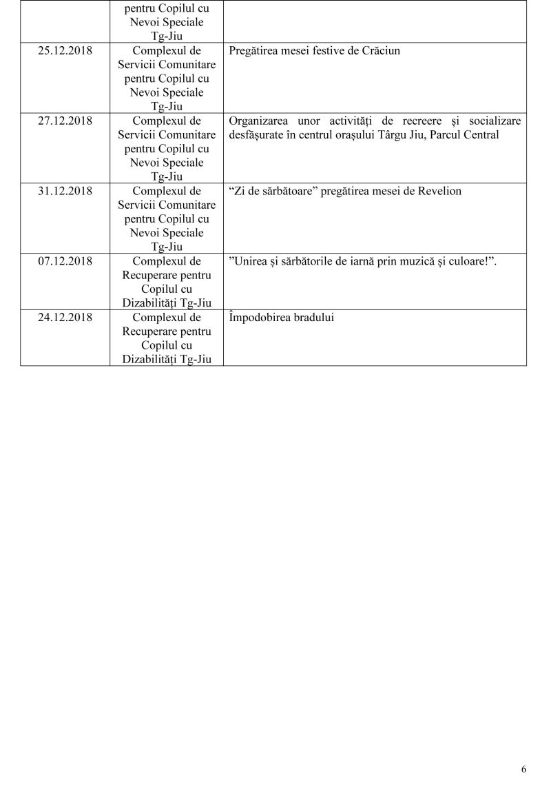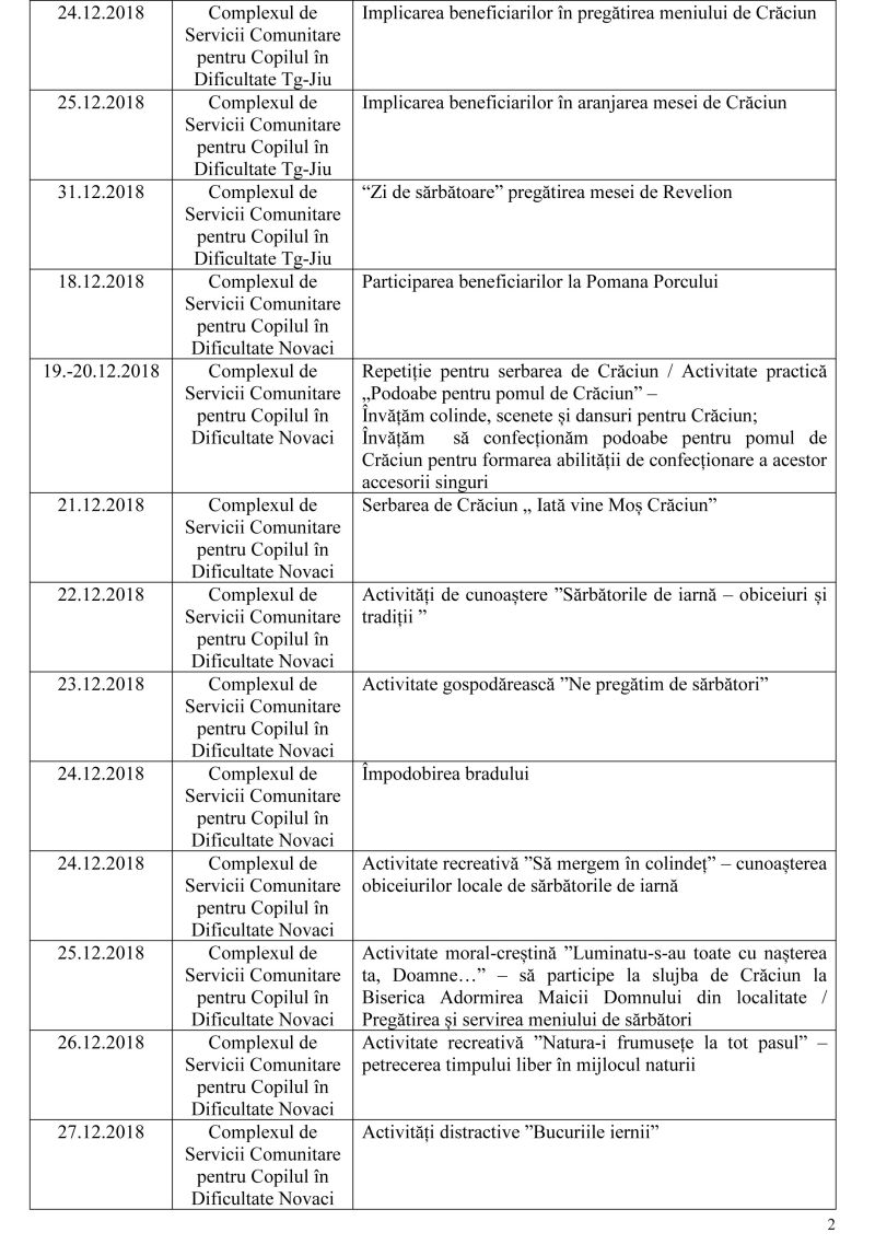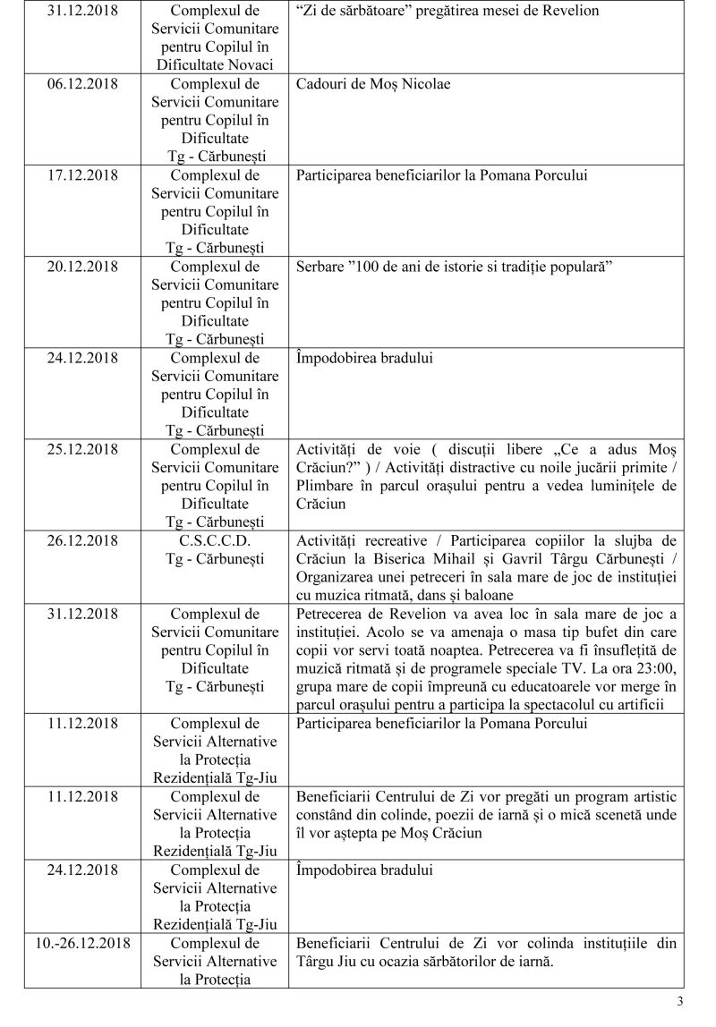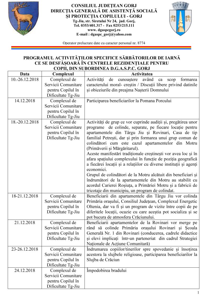 multe evenimente specifice perioadei Sărbătorilor de iarnă. Astfel, s-a stabilit ca în fiecare complex de servicii să se organizeze tradiționala pomana porcului, în diferite zile. De asemenea, au fost programate serbări de Crăciun, care cuprind programe artistice susținute de beneficiari ai centrelor, aceștia interpretând colinde, cântece specifice Sărbătorilor de iarnă, precum și poezii. Se vor împodobi brazi de Crăciun la toate centrele subordonate DGASPC Gorj, locațiile fiind decorate corespunzător. În plus, în prag de sărbători, beneficiarii vor primi cadouri de la sponsori și de la oameni cu suflet mare din județ.Trebuie precizat și faptul că, atât pentru masa de Crăciun și pentru cea de Anul Nou, meniul beneficiarilor va fi compus și din preparate tradiționale: salată boeuf, sarmale cu mămăliguță și piftie, friptură de porc la tavă, dulciuri și fructe. ”Ne străduim să creăm, în fiecare centru, o atmosferă cât mai asemănătoare cu cea a mediului familial. Am făcut și facem eforturi pentru a aduce în sufletele beneficiarilor noștri spiritul Sărbătorilor de iarnă, astfel încât aceștia să nu resimtă lipsa familiei și a celor dragi”, a declarat directorul general al DGASPC Gorj, Laurențiu Diaconescu.