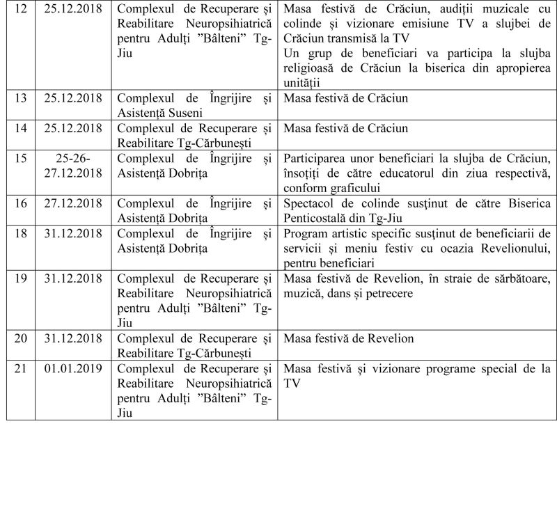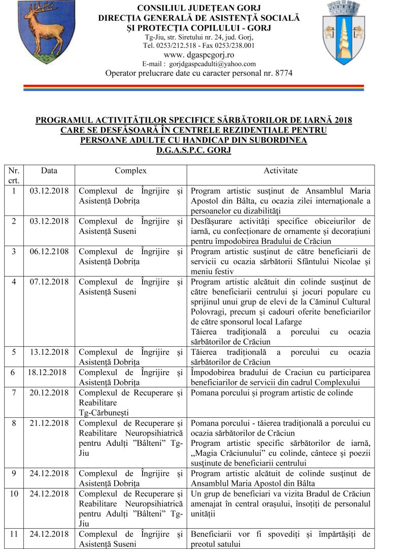 multe evenimente specifice perioadei Sărbătorilor de iarnă. Astfel, s-a stabilit ca în fiecare complex de servicii să se organizeze tradiționala pomana porcului, în diferite zile. De asemenea, au fost programate serbări de Crăciun, care cuprind programe artistice susținute de beneficiari ai centrelor, aceștia interpretând colinde, cântece specifice Sărbătorilor de iarnă, precum și poezii. Se vor împodobi brazi de Crăciun la toate centrele subordonate DGASPC Gorj, locațiile fiind decorate corespunzător. În plus, în prag de sărbători, beneficiarii vor primi cadouri de la sponsori și de la oameni cu suflet mare din județ.Trebuie precizat și faptul că, atât pentru masa de Crăciun și pentru cea de Anul Nou, meniul beneficiarilor va fi compus și din preparate tradiționale: salată boeuf, sarmale cu mămăliguță și piftie, friptură de porc la tavă, dulciuri și fructe. ”Ne străduim să creăm, în fiecare centru, o atmosferă cât mai asemănătoare cu cea a mediului familial. Am făcut și facem eforturi pentru a aduce în sufletele beneficiarilor noștri spiritul Sărbătorilor de iarnă, astfel încât aceștia să nu resimtă lipsa familiei și a celor dragi”, a declarat directorul general al DGASPC Gorj, Laurențiu Diaconescu.