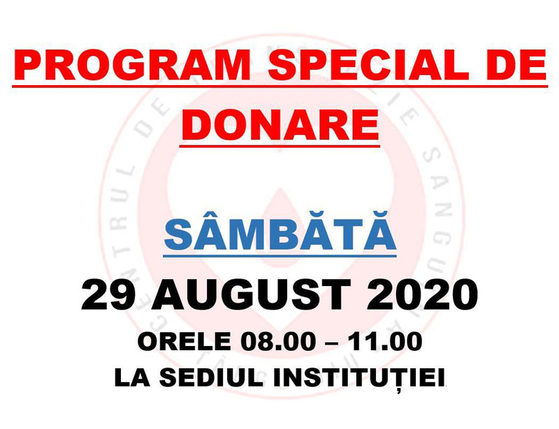 La finele acestei luni, Centrul de Transfuzie Sanguină organizează un nou program special de donare de sânge! Centrul de Transfuzie Sanguină din municipiul Târgu-Jiu îi așteaptă sâmbătă, 29 august 2020, între orele 08.00-11.00, pe toți cei care doresc să doneze sânge, însă programul de lucru din timpul săptămânii nu le-a permis să doneze.„Donează sânge, fii generos! Sângele este o resursă naţională; donarea de sânge este un act voluntar, anonim şi neremunerat. Sâmbătă, 29 august 2020, îi așteptăm pe toți cei care doresc să doneze sânge, la sediul nostru, între orele 08.00-11.00, mai ales pe cei pe care programul încărcat de lucru din timpul săptămânii i-a împiedicat să doneze”, au transmis organizatorii.