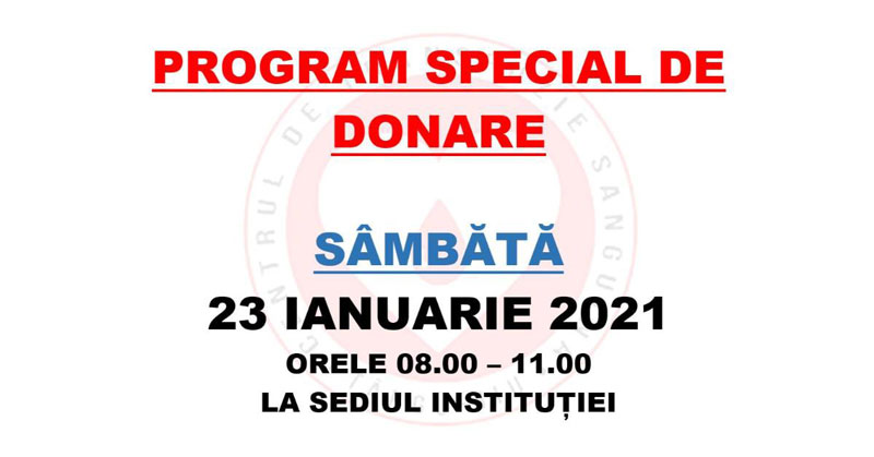 Sâmbătă, Centrul de Transfuzie Sanguină organizează un nou program special de donare de sânge! Astfel, Centrul de Transfuzie Sanguină din municipiul Târgu-Jiu îi așteaptă pe 23 ianuarie 2021, între orele 08.00-11.00, pe toți cei care doresc să doneze sânge, însă programul de lucru din timpul săptămânii nu le-a permis să doneze. „Donează sânge, fii generos! Sângele este o resursă națională; donarea de sânge este un act voluntar, anonim și neremunerat. Sâmbătă, 23 ianuarie 2021, îi așteptăm pe toți cei care doresc să doneze sânge, la sediul nostru, între orele 08.00-11.00, mai ales pe cei pe care programul încărcat de lucru din timpul săptămânii i-a împiedicat să doneze”, au transmis organizatorii.