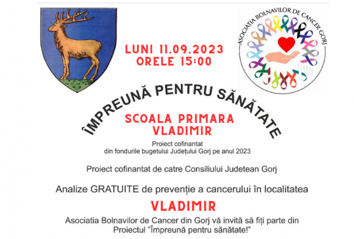 Asociația Bolnavilor de Cancer din Gorj organizează, în comuna Vladimir -în cadrul Proiectului „Împreună pentru Sănătate!” – o nouă întâlnire cu cetățenii care vor să beneficieze de consultații preventive gratuite.